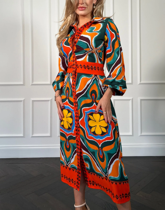 Introducing the luxurious Orange Abstract Shirt Dress. This stunning dress boasts a unique abstract design, adding an artistic flair to your wardrobe. Made with premium materials, it offers both style and comfort. Elevate your look with this sophisticated and exclusive statement piece. Pair with heels or trainers for a perfect day to night look!